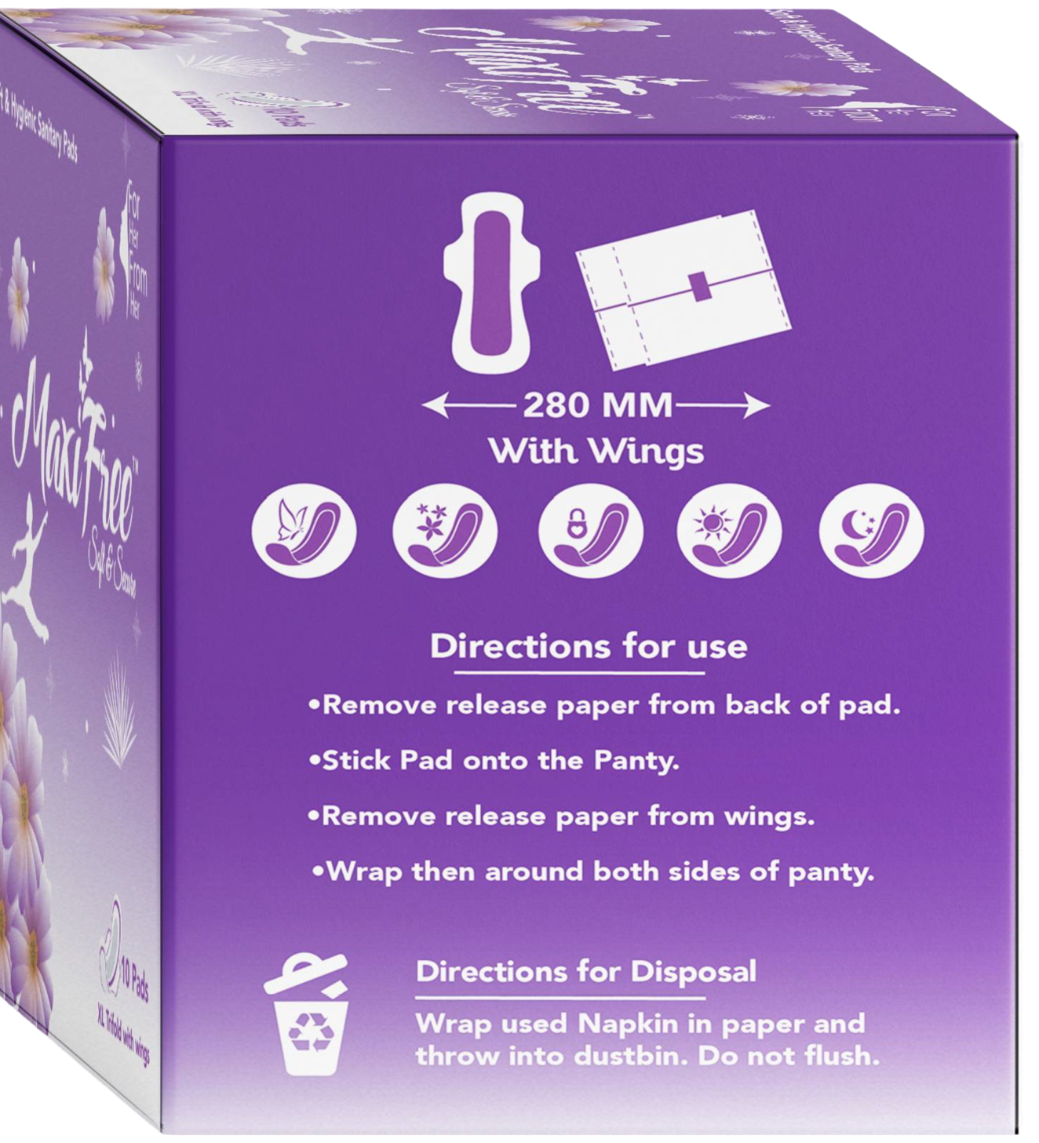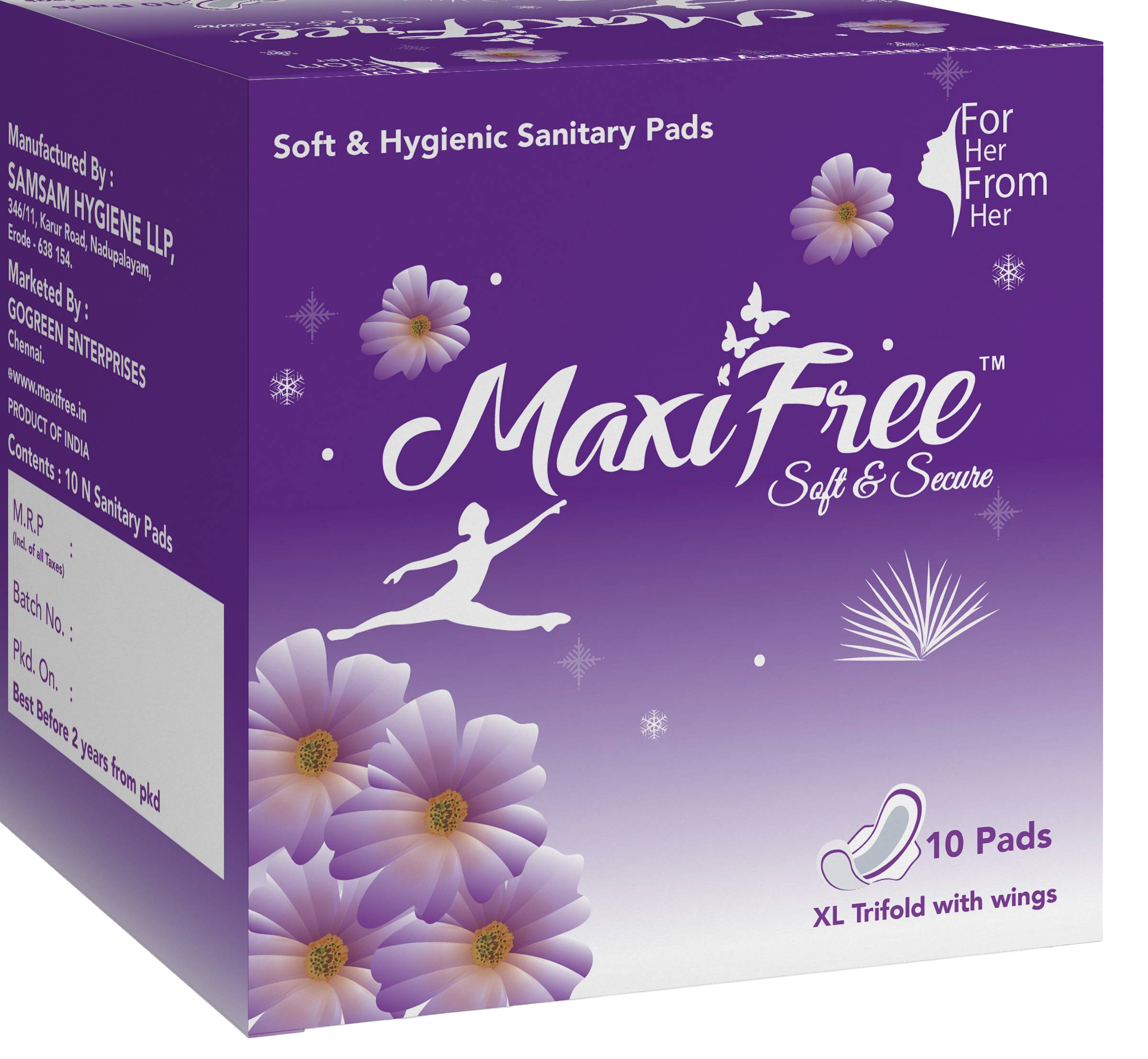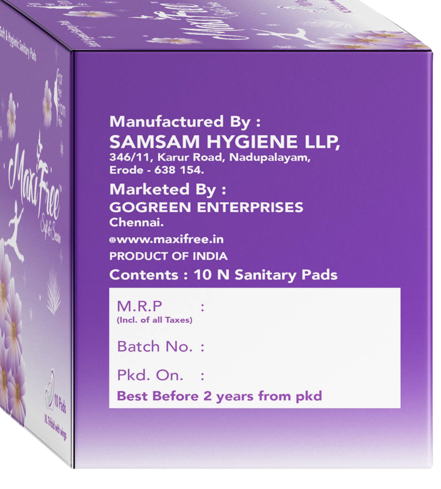 Maxifree is fully made up of natural plant and plant based material as ingredients,which makes the pads unique when compared with other pads. It is made in India. Maxifree soft and secure pad is suitable for all types of flows during menstrual periods. Maxifree soft and secure is free of plastic, Chemicals such as toxic materials like Dioxins, Bleaching like Chlorine etc., and so free from skin rashes,itches and irritation.